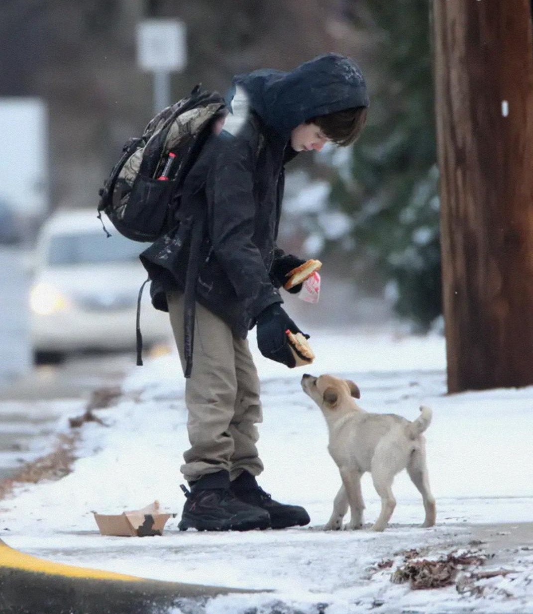 He didn’t notice me. He knelt behind the store, unzipped his backpack, and pulled out a sandwich wrapped in wax paper. Carefully, he unwrapped it and tore it in half. He set one half on the ground, just by a rusted dumpster.